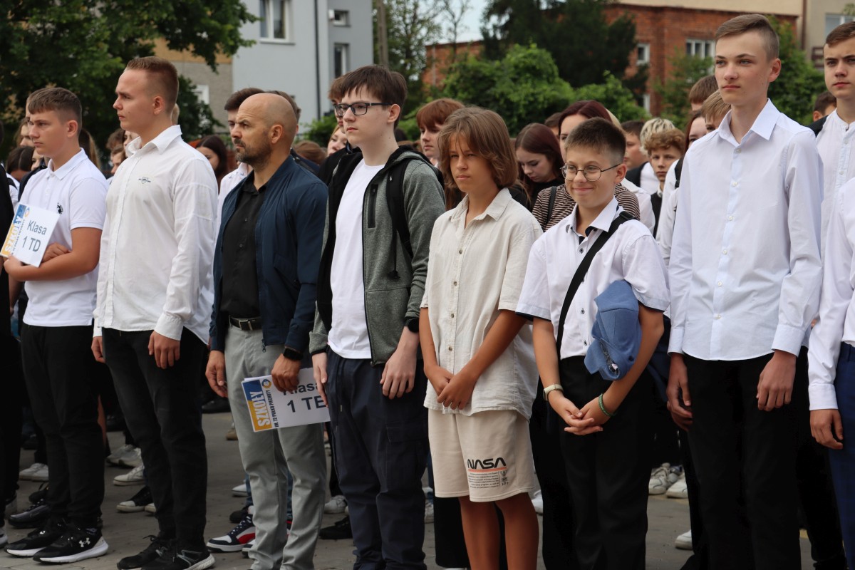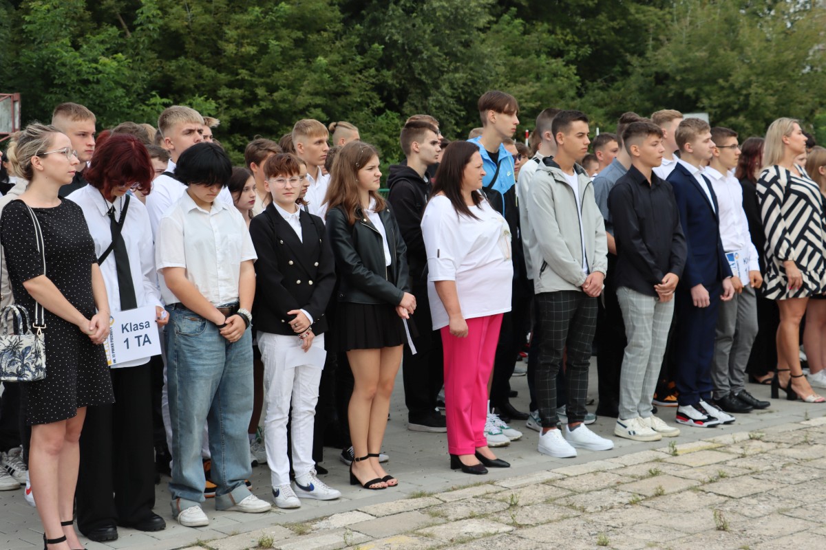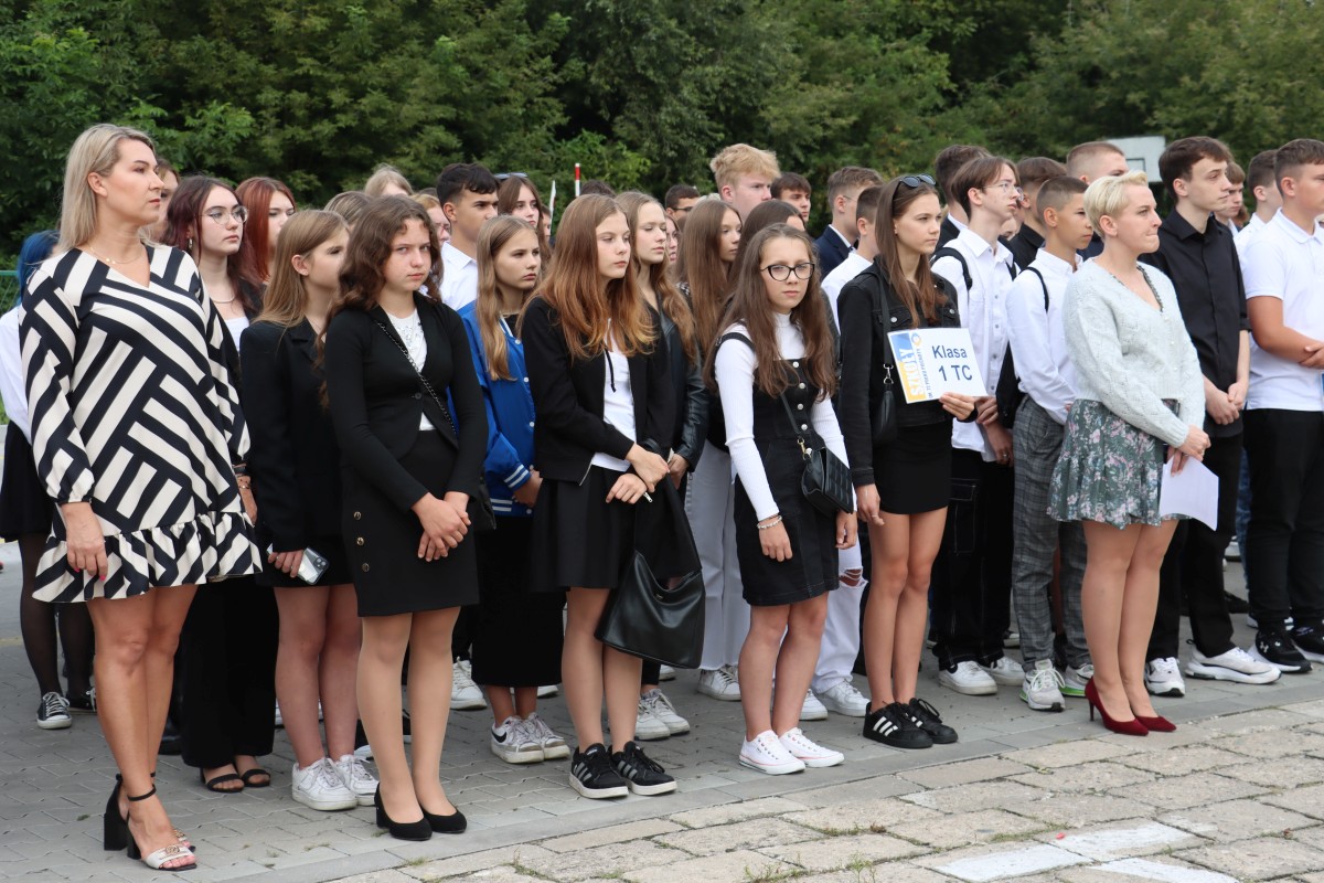 Wypoczęci, uśmiechnięci, pełni pomysłów i zapału. W takich nastrojach 4 września 2023 r. powitali nowy rok nauki uczniowie Szkół im. 72 Pułku Piechoty w Radomiu. Na młodzież czekali wychowawcy i nauczyciele, świetnie przygotowane i wyposażone pracownie dydaktyczne, w tym jedna z nowocześniejszych w mieście sal gimnastycznych. Z grona rekordowej liczby 1000 uczniów, którzy w roku szkolnym 2023/2024 podejmują naukę przy ul. Saskiej 4/6, w sposób szczególny byli witani pierwszoklasiści. Wybrali edukację na tak atrakcyjnych kierunkach, jak: logistyka, informatyka, lotniskowe służby operacyjne, transport kolejowy, hotelarstwo, żywienie i usługi gastronomiczne, usługi fryzjerskie i po raz pierwszy – na kierunku technik programista. Inaugurując uroczyście nowy rok szkolny, dyrektor Katarzyna Kołodziejska podkreśliła, że obecny rok nauki jest wyjątkowy, gdyż przypada w 250. rocznicę powstania Komisji Edukacji Narodowej, nierozerwalnie kojarzonej mimo upływu lat z nowoczesnym kształceniem młodego pokolenia. Życzę – powiedziała Pani Dyrektor – by zdobyta wiedza i umiejętności pozwoliły wam zrealizować własne, wymarzone cele zawodowe. Na pewno pomogą w tym doświadczeni nauczyciele oraz ambitne programy ministerialne i europejskie, w których biorą udział Szkoły im. 72 Pułku Piechoty. Jedną z nowości jest Branżowe Centrum Umiejętności, które oznacza dla szkoły perspektywę dalszego rozwoju. Z okazji rozpoczęcia nowego roku nauki szef Wojskowego Centrum Rekrutacji w Radomiu ppłk Sławomir Głowiński odczytał list skierowany do uczniów klas mundurowych przez gen. bryg. Mirosława Brysia, szefa Centralnego Wojskowego Centrum Rekrutacji. Jak przystało na placówkę oświatową, zaangażowaną w wychowanie patriotyczne i proobronne młodzieży, uroczystość uświetniła swoją obecnością kompania reprezentacyjna. Na zakończenie uczniowie udali się wraz z wychowawcami na spotkanie do sal lekcyjnych.