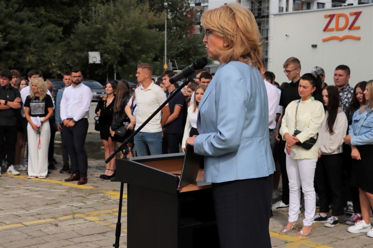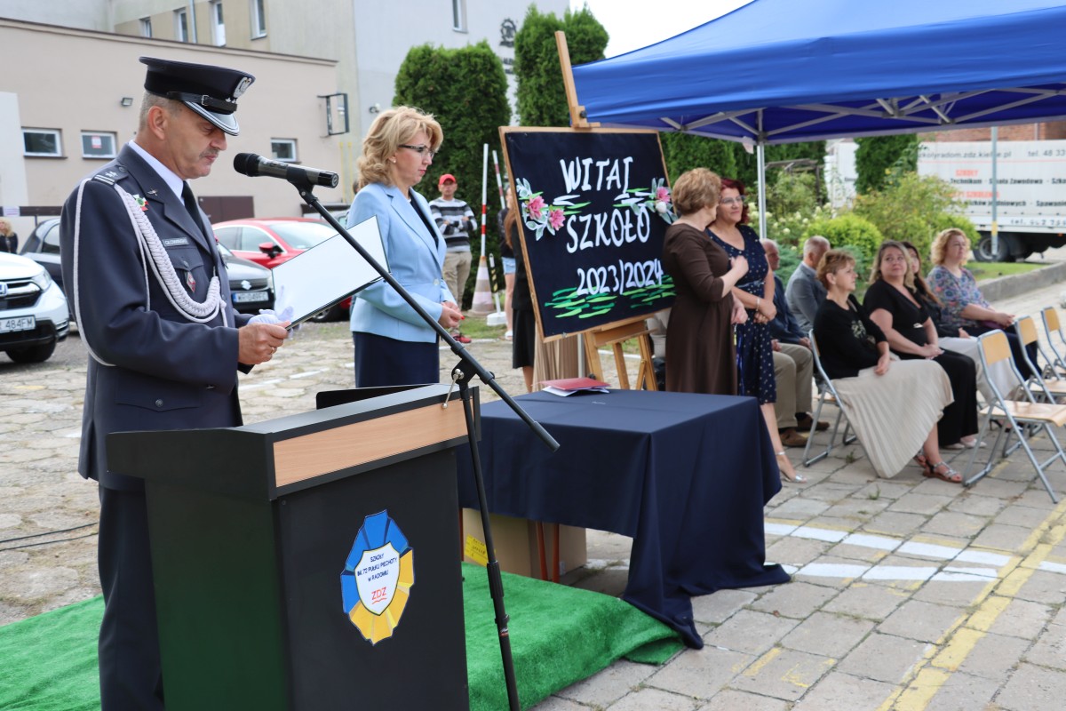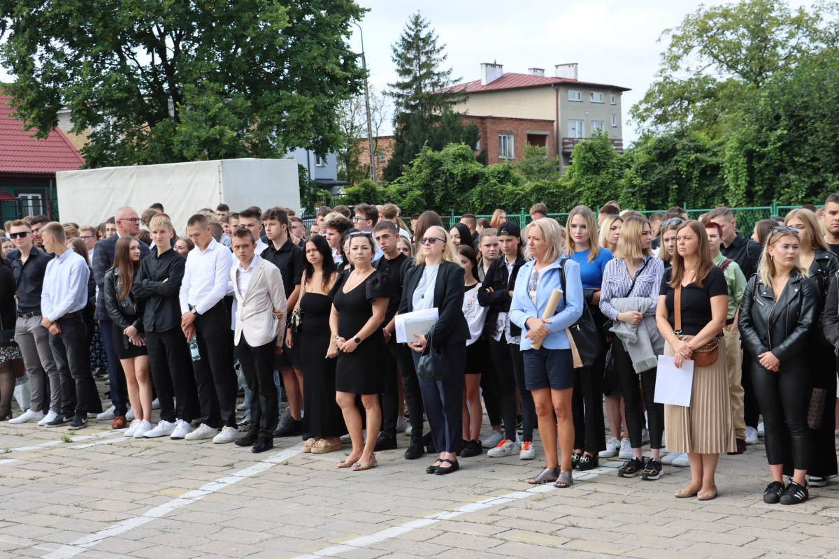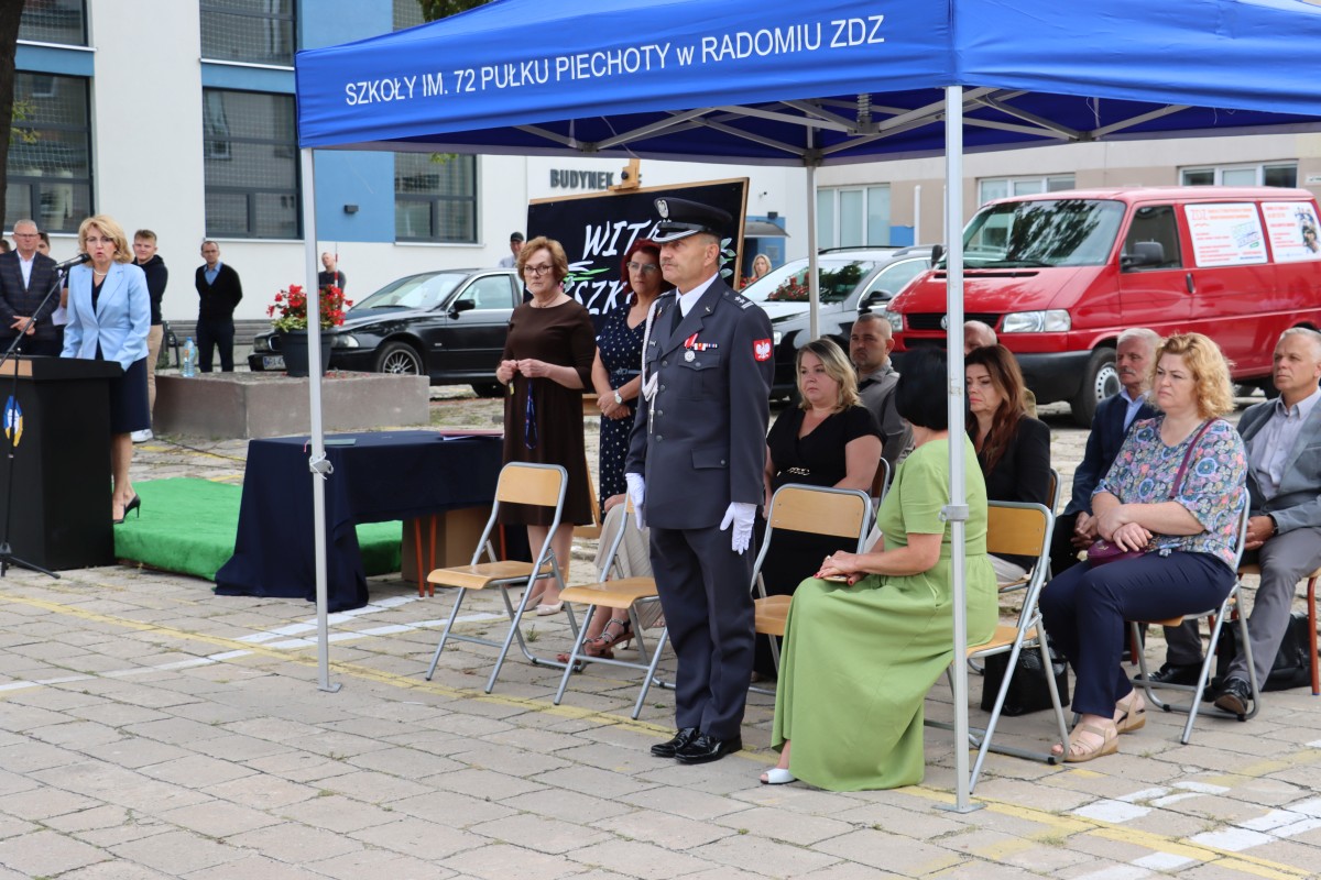 Wypoczęci, uśmiechnięci, pełni pomysłów i zapału. W takich nastrojach 4 września 2023 r. powitali nowy rok nauki uczniowie Szkół im. 72 Pułku Piechoty w Radomiu. Na młodzież czekali wychowawcy i nauczyciele, świetnie przygotowane i wyposażone pracownie dydaktyczne, w tym jedna z nowocześniejszych w mieście sal gimnastycznych. Z grona rekordowej liczby 1000 uczniów, którzy w roku szkolnym 2023/2024 podejmują naukę przy ul. Saskiej 4/6, w sposób szczególny byli witani pierwszoklasiści. Wybrali edukację na tak atrakcyjnych kierunkach, jak: logistyka, informatyka, lotniskowe służby operacyjne, transport kolejowy, hotelarstwo, żywienie i usługi gastronomiczne, usługi fryzjerskie i po raz pierwszy – na kierunku technik programista. Inaugurując uroczyście nowy rok szkolny, dyrektor Katarzyna Kołodziejska podkreśliła, że obecny rok nauki jest wyjątkowy, gdyż przypada w 250. rocznicę powstania Komisji Edukacji Narodowej, nierozerwalnie kojarzonej mimo upływu lat z nowoczesnym kształceniem młodego pokolenia. Życzę – powiedziała Pani Dyrektor – by zdobyta wiedza i umiejętności pozwoliły wam zrealizować własne, wymarzone cele zawodowe. Na pewno pomogą w tym doświadczeni nauczyciele oraz ambitne programy ministerialne i europejskie, w których biorą udział Szkoły im. 72 Pułku Piechoty. Jedną z nowości jest Branżowe Centrum Umiejętności, które oznacza dla szkoły perspektywę dalszego rozwoju. Z okazji rozpoczęcia nowego roku nauki szef Wojskowego Centrum Rekrutacji w Radomiu ppłk Sławomir Głowiński odczytał list skierowany do uczniów klas mundurowych przez gen. bryg. Mirosława Brysia, szefa Centralnego Wojskowego Centrum Rekrutacji. Jak przystało na placówkę oświatową, zaangażowaną w wychowanie patriotyczne i proobronne młodzieży, uroczystość uświetniła swoją obecnością kompania reprezentacyjna. Na zakończenie uczniowie udali się wraz z wychowawcami na spotkanie do sal lekcyjnych.