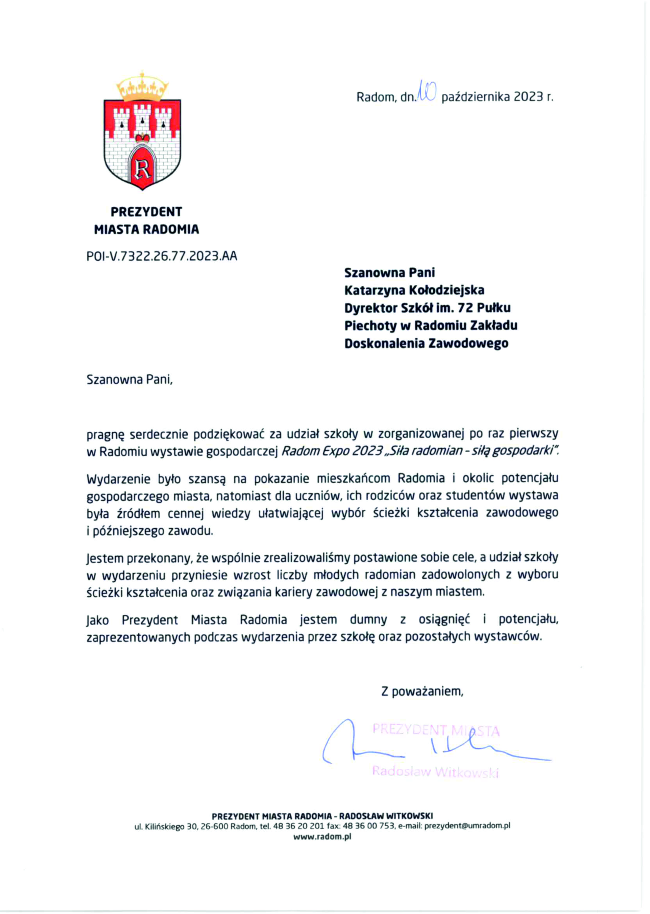 „Jestem przekonany, że wspólnie zrealizowaliśmy postawione sobie cele, a udział szkoły w wydarzeniu przyniesie wzrost liczby młodych radomian zadowolonych z wyboru ścieżki kształcenia oraz związania kariery zawodowej z naszym miastem (…) Jako Prezydent Miasta Radomia jestem dumny z osiągnięć i potencjału, zaprezentowanych podczas wydarzenia przez szkołę i pozostałych wystawców” – napisał między innymi prezydent Radosław Witkowski w piśmie skierowanym do dyrektor Katarzyny Kołodziejskiej, dziękując za aktywny udział Szkół im. 72 Pułku Piechoty w wystawie gospodarczej Radom Expo 2023 „Siła radomian – siłą gospodarki”. Przypomnijmy, na naszym stoisku promocyjnym w hali Radomskiego Centrum Sportu odbyły się pokazy kuchni molekularnej w wykonaniu uczniów i nauczycieli kierunku Technik żywienia i usług gastronomicznych. Prezentacje połączone z degustacjami spotkały się z ogromnym zainteresowaniem odwiedzających wystawę gości. Podobnie jak widowiskowy pokaz musztry w wykonaniu kompanii reprezentacyjnej szkoły.