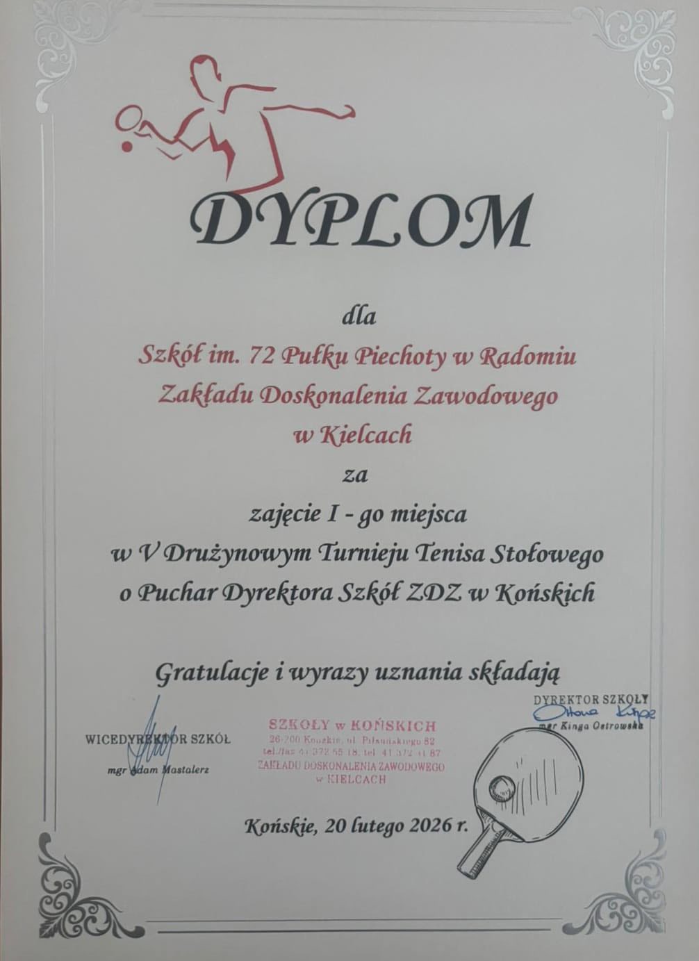 W piątek 20.02.2026 r. w Szkołach Zakładu Doskonalenia Zawodowego w Końskich odbył się V Międzyszkolny Turniej Tenisa Stołowego dla uczniów Szkół ZDZ.