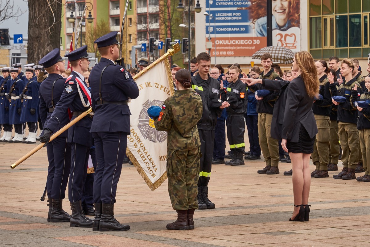 200 uczniów klas pierwszych Szkół im. 72 Pułku Piechoty w Radomiu Zakładu Doskonalenia Zawodowego złożyło ślubowanie zgodne z wojskowym ceremoniałem. Główna uroczystość odbyła się 19 kwietnia 2023 r. na Placu. Jagiellońskim. Ceremoniał poprzedziła msza święta w Kościele Garnizonowym, sprawowana w intencji społeczności szkolnej. Wśród gości uroczystości byli przedstawiciele władz państwowych, oświatowych oraz samorządowych, także służby mundurowe, partnerzy szkoły w realizacji edukacji wojskowej, policyjnej i strażackiej. - To już 14 rok, kiedy kultywujemy tradycję ślubowania uczniów klas pierwszych. Ta uroczystość z każdym rokiem coraz bardziej zachwyca. Jestem dumna, że tylu młodych ludzi pragnie zdobywać nowe kwalifikacji, jednocześnie rozwijając w sobie etos patriotyzmu i poświęcenia dla ojczyzny. Obecność klas mundurowych w naszej szkole nie jest przypadkowa. Placówka nosi imię 72 pułku piechoty, tak blisko związanego z historią Radomia - mówiła dyrektor Katarzyna Kołodziejska. Wyboru szkoły pogratulował uczniom Wojciech Skurkiewicz, wiceminister obrony narodowej, życząc tego, aby w przyszłości zostali żołnierzami Wojska Polskiego. Jak podkreśliła Katarzyna Kalinowska, zastępca prezydenta Radomia, Szkoły ZDZ z blisko 30 kierunkami kształcenia są ważnym punktem na edukacyjnej mapie Radomia. - Życzę składającym ślubowanie uczniom, by po zakończeniu edukacji mieli ogromną satysfakcję i poczucie dobrze podjętej decyzji – powiedziała wiceprezydent. Młodzieży udzielił błogosławieństwa ks. mjr Łukasz Józef Hubacz, proboszcz Kościoła Garnizonowego. Za wyjątkowo wzruszającą uroczystość podziękowali dyrekcji i gronu pedagogicznemu szkoły rodzice. Uczniowie zaś nie kryli radości, zgodnie stwierdzając, że ten dzień zapamiętają na długo. Od pierwszych dni nauki w szkole czują się pełnoprawnymi członkami społeczności szkolnej. Teraz pełnym sercem będą realizować słowa wypowiedzianej przysięgi. Ślubowanie było też okazją, aby wyróżnić listami gratulacyjnymi pierwszoklasistów, którzy zaangażowali się w przygotowanie uroczystości. Jak co roku, uczestnicy i obserwatorzy tej uroczystości nagrodzili gromkimi brawami pokazy umiejętności uczniów klas fryzjerskich oraz naszej kompanii reprezentacyjnej. Blisko dwugodzinny ceremoniał zakończyła efektowna defilada kompanii reprezentacyjnych zaprzyjaźnionych szkół m.in. z Kielc, Ostrowca Świętokrzyskiego, Nowego Miasta n. Pilicą i Sokołowa Podlaskiego. Radomianie zaś mogli poczęstować się prawdziwą żołnierską grochówką.