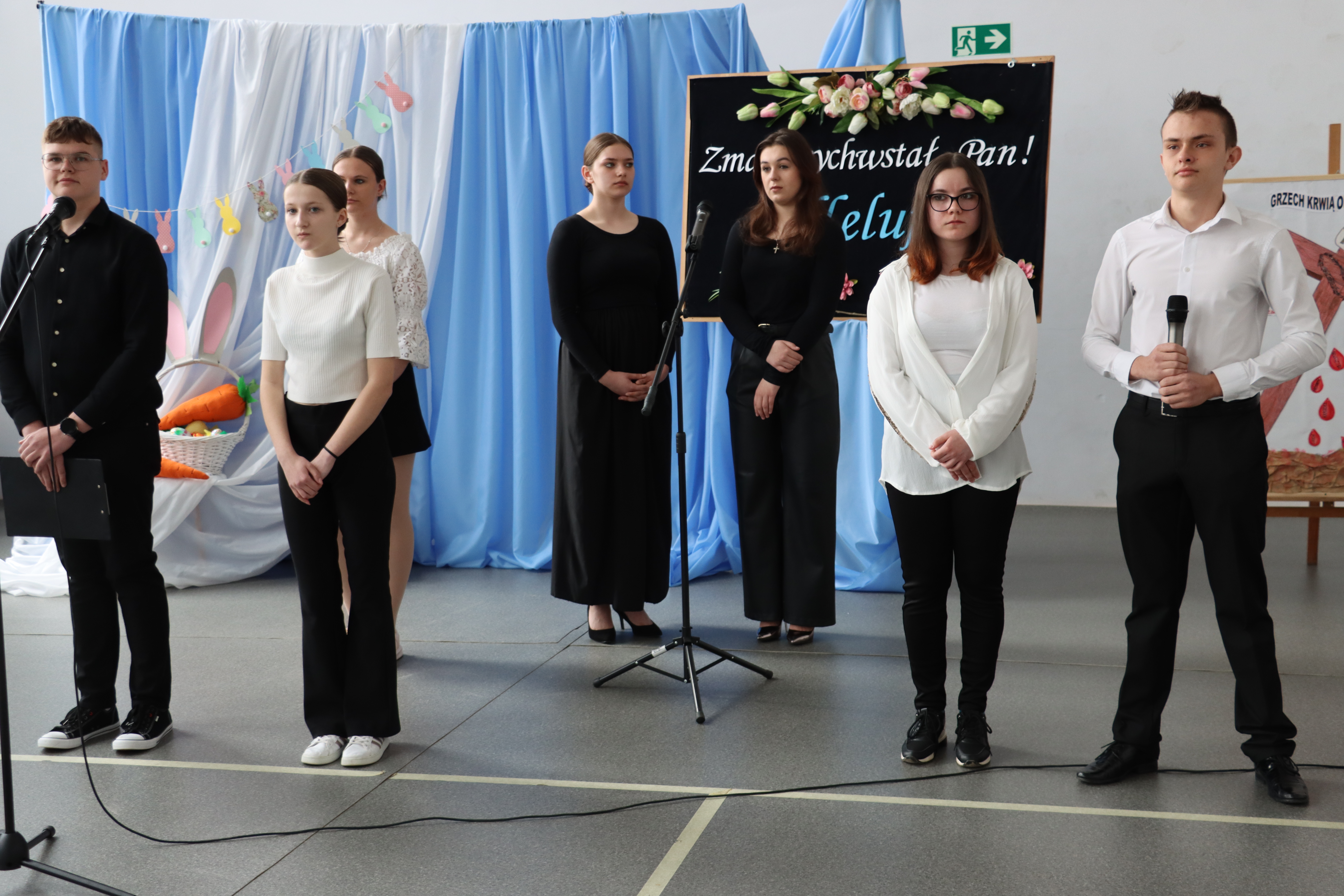 Dni poprzedzające Wielkanoc, najważniejsze święto w kalendarzu liturgicznym, to czas dzielenia się symbolicznym jajkiem i składania życzeń. Nie inaczej jest w naszej szkole. 5 kwietnia 2023 r., w ostatni dzień nauki przed świąteczną przerwą, odbyło się spotkanie, którego głównym punktem była część artystyczna. Grupa uczniów pod kierunkiem Pani Katechetki Katarzyny Pyzary przedstawiła okolicznościowy program słowno-muzyczny. Na wszystkich czekał też poczęstunek. Pani Dyrektor Katarzyna Kołodziejska w imieniu swoim i grona pedagogicznego złożyła życzenia świątecznej radości, rodzinnej miłości i pokładów nadziei płynącej z tajemnicy Zmartwychwstania.