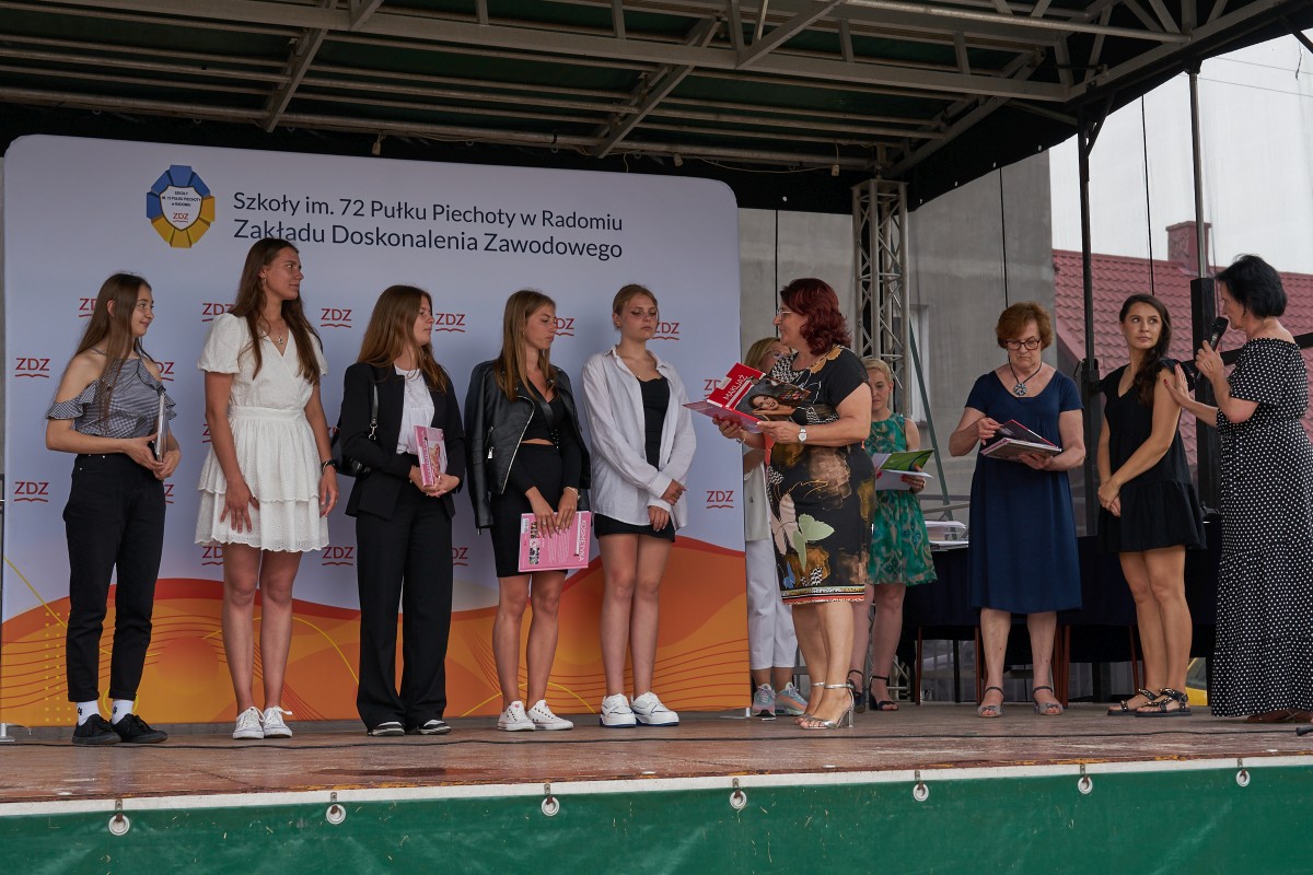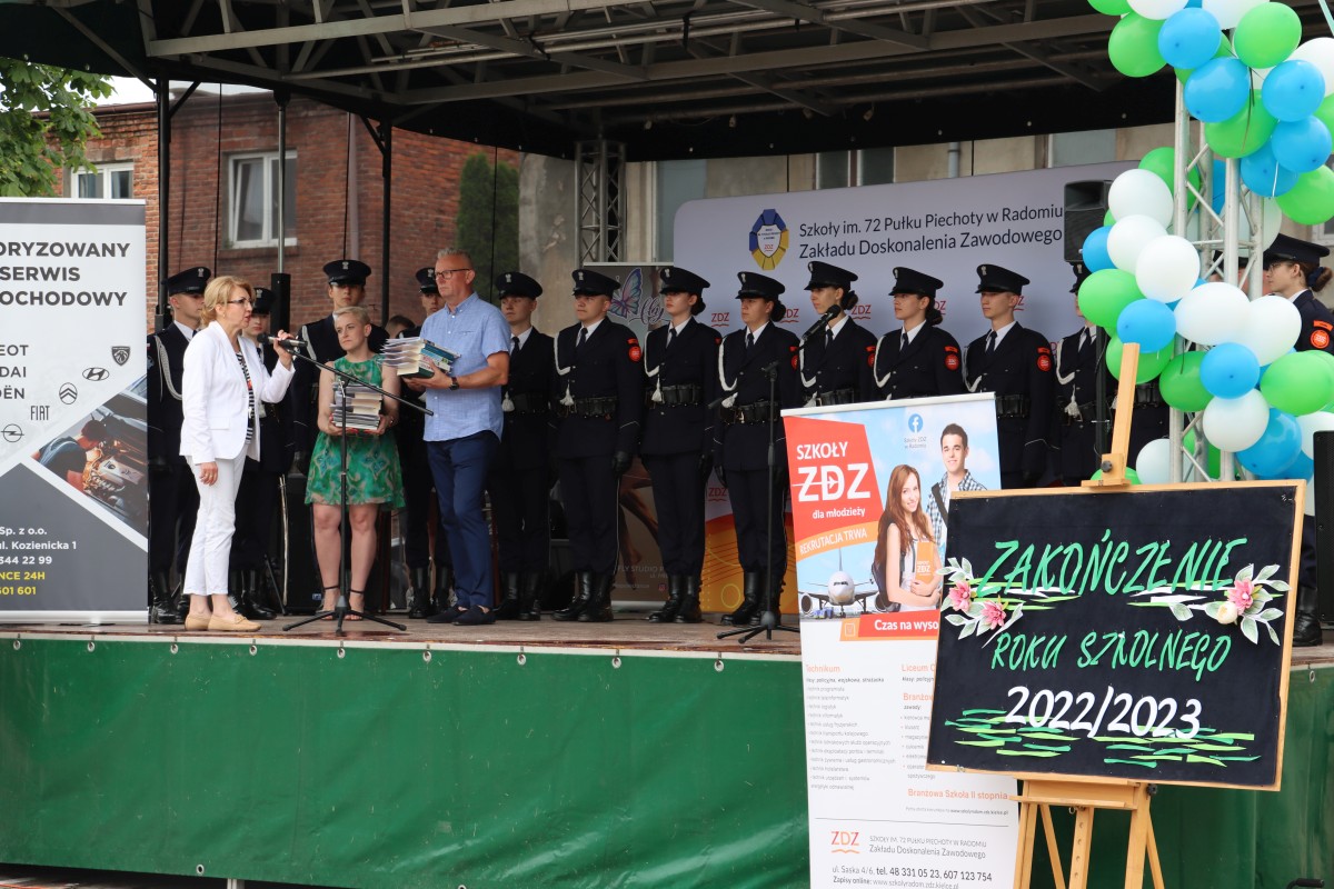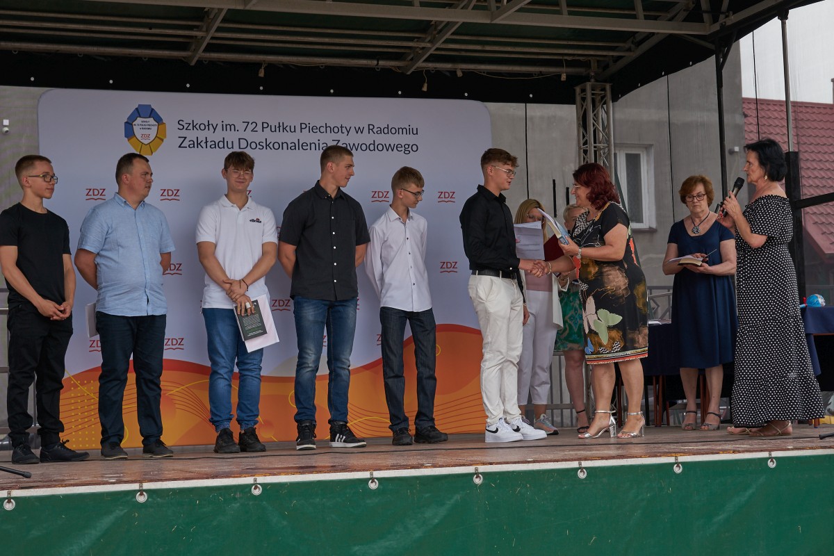 23 czerwca 2023 r. pożegnaliśmy rok szkolny 2022/2023. Oficjalnie i uroczyście, ale inaczej niż we wszystkich szkołach. Wręczanie świadectw, nagród dla prymusów i listów gratulacyjnych odbyło się w atmosferze festynu połączonego z motopiknikiem. A wszystko pod hasłem „Zaczynamy bezpieczne wakacje”. Swoje stoiska wystawili: Wodne Ochotnicze Pogotowie Ratunkowe, Wojskowe Centrum Rekrutacji oraz Fiat Tipo S-Design T-Jet by DDCustom, która zapewniła takie atrakcje, jak strefa car audio czy pokazy aut. Koniec roku szkolnego był także okazją do zaprezentowania umiejętności uczniów. Na specjalnie przygotowanej scenie wystąpili między innymi duet akrobatyczny, grupa samoobrony, mistrzowska kompania reprezentacyjna. Na wszystkich czekał grill. Nie mogło obyć się bez życzeń udanego, wakacyjnego i bezpiecznego wypoczynku zarówno dla młodzieży, jak i nauczycieli. Złożyła je dyrektor szkoły Katarzyna Kołodziejska, a także licznie przybyli goście. Wśród nich wiceprezydent Radomia Katarzyna Kalinowska, przedstawiciele służb mundurowych i pracodawców, z którymi szkoła współpracuje w kształceniu zawodowym uczniów.