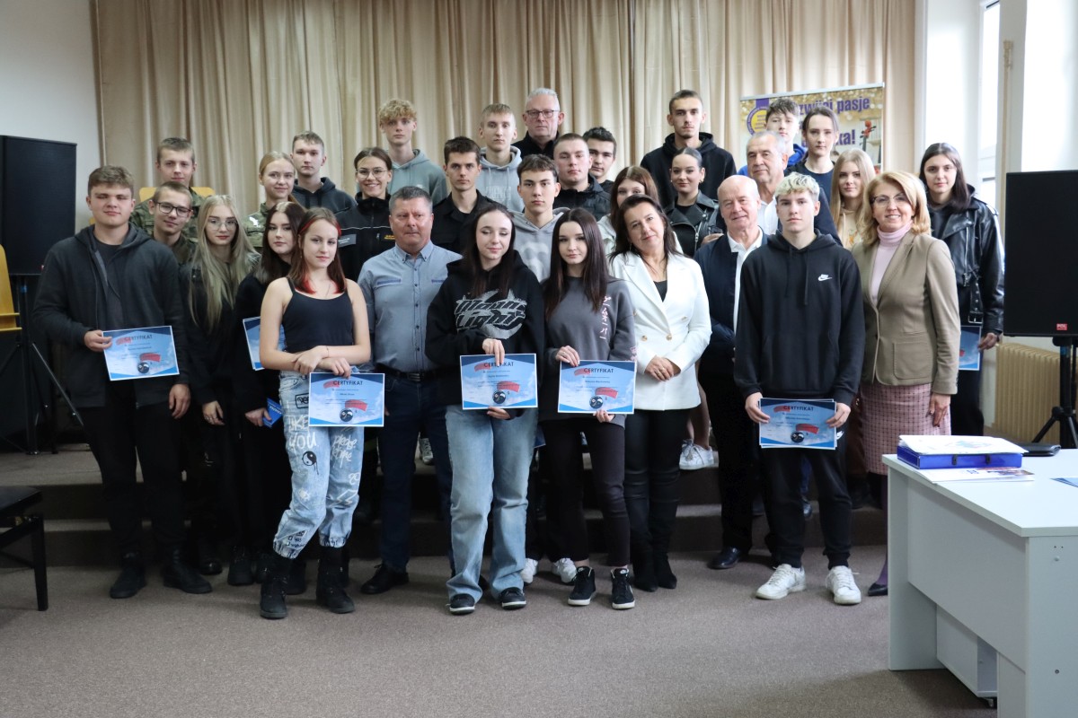 13 listopada 2023 r. ok. 30 uczniów klas mundurowych, którzy pomyślnie zakończyli kurs na skoczka spadochronowego w Aeroklubie Radomskim, odebrało certyfikaty potwierdzające nabyte umiejętności. Szkolenie przeprowadzone w połowie października, po raz pierwszy zostało zorganizowane na terenie lotniska w Piastowie. Certyfikatów i nabycia dodatkowych umiejętności pogratulowała młodzieży dyrektor szkoły Katarzyna Kołodziejska: - Jesteście dla mnie bohaterami, choć dla was była to ciekawa, podniebna przygoda i wielka frajda – powiedziała Pani Dyrektor. – Zawsze pamiętajcie, że życie i zdrowie są dla każdego najważniejsze. Szkoła na pewno będzie was wspierać w bezpiecznym rozwijaniu tej pasji, która jest wielkim atutem w pracy w służbach mundurowych. W spotkaniu wzięli udział goście: Dorota Rajkowska, prezes Aeroklubu Radomskiego oraz instruktorzy skoków spadochronowych. Pani Prezes zaprosiła uczniów na plenerowe ćwiczenie ze scenariuszem iście filmu fabularnego. 22 listopada na terenie lotniska w Piastowie dojdzie do symulowanego zderzenia samochodów z samolotem, z podejrzeniem o atak terrorystyczny w tle. Do akcji w obecności pozorantów włączone zostaną wszystkie służby ratunkowe...
