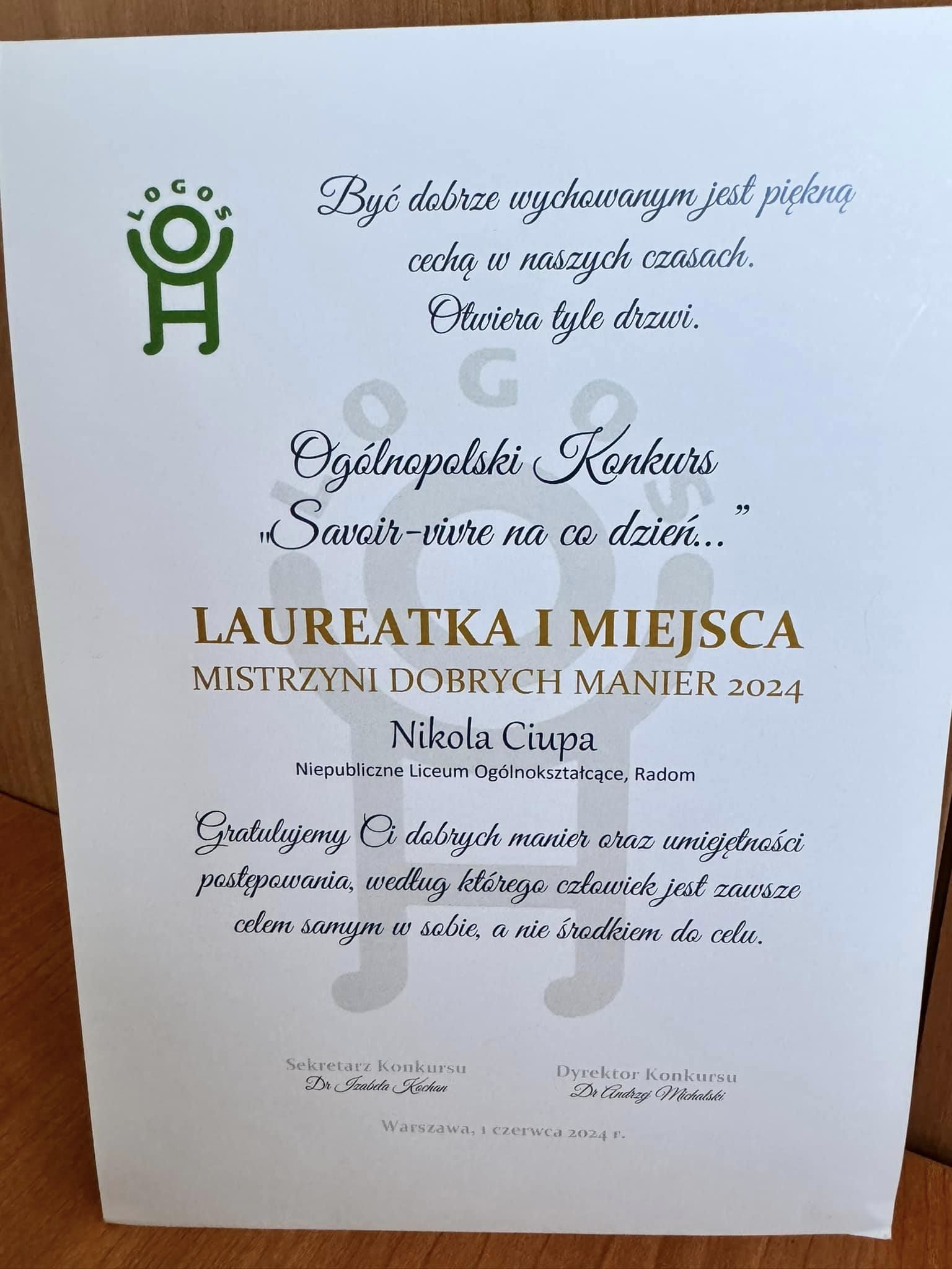 Centrum Edukacji Humanistycznej LOGOS zaprosiło uczniów szkół ponadpodstawowych z całej Polski do niecodziennego sprawdzianu umiejętności. To Ogólnopolski Konkurs pn. „Savoir – vivre na co dzień”. Zadaniem uczestników było rozwiązywanie testu z konkretnymi sytuacjami i zachowaniami. Najlepszy wynik osiągnęła uczennica z klasy 1 TF, Nikola Ciupa, tym samym zwyciężając w konkursie. Nikola otrzymała tytuł Mistrzyni Dobrych Manier 2024. Dumna ze swojej uczennicy nauczycielka języka polskiego, Katarzyna Krucińska, zwróciła uwagę na konkursowe motto: „Być dobrze wychowanym jest piękną cechą w naszych czasach. Otwiera tyle drzwi”. Warto o tym pamiętać!