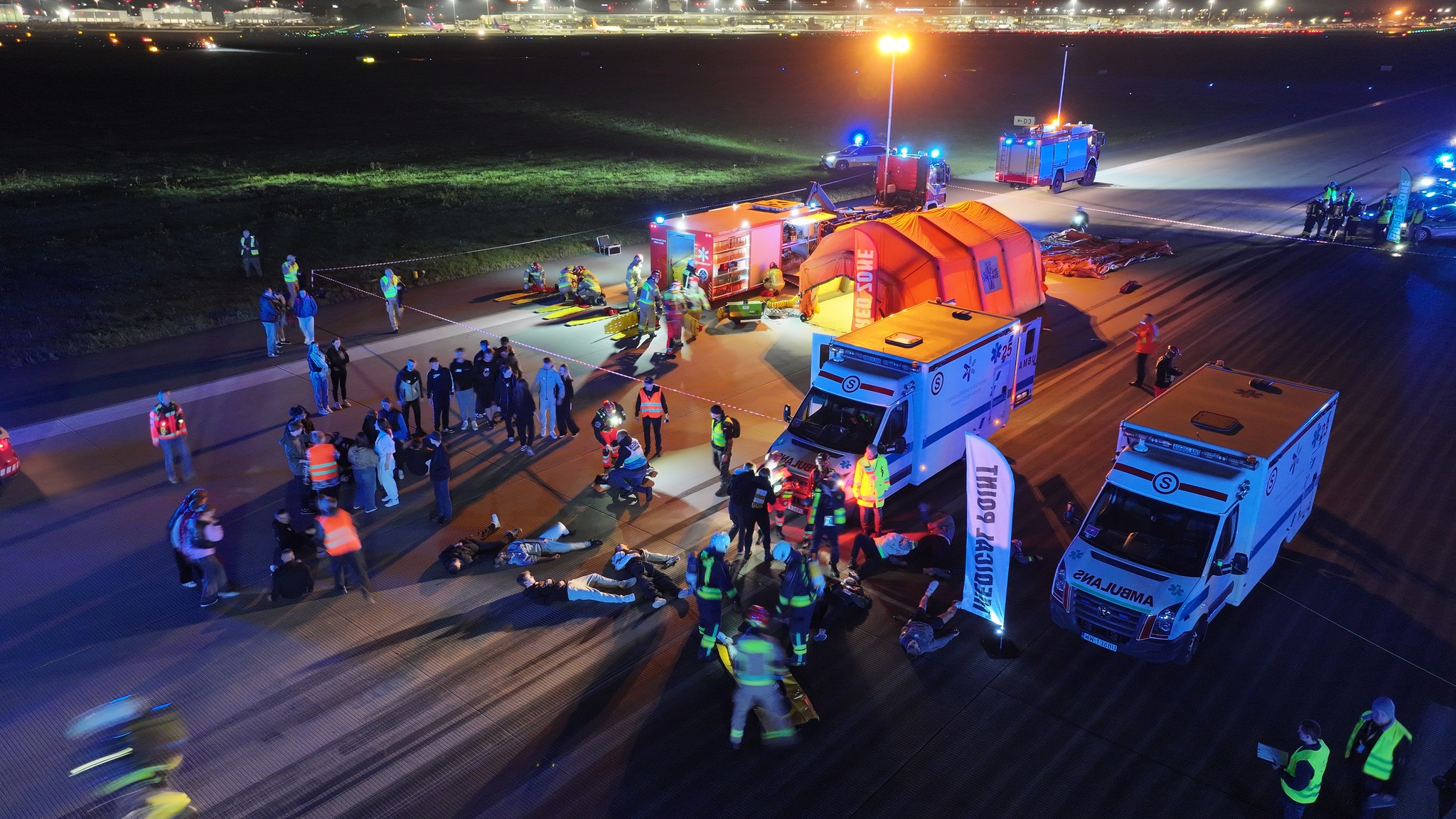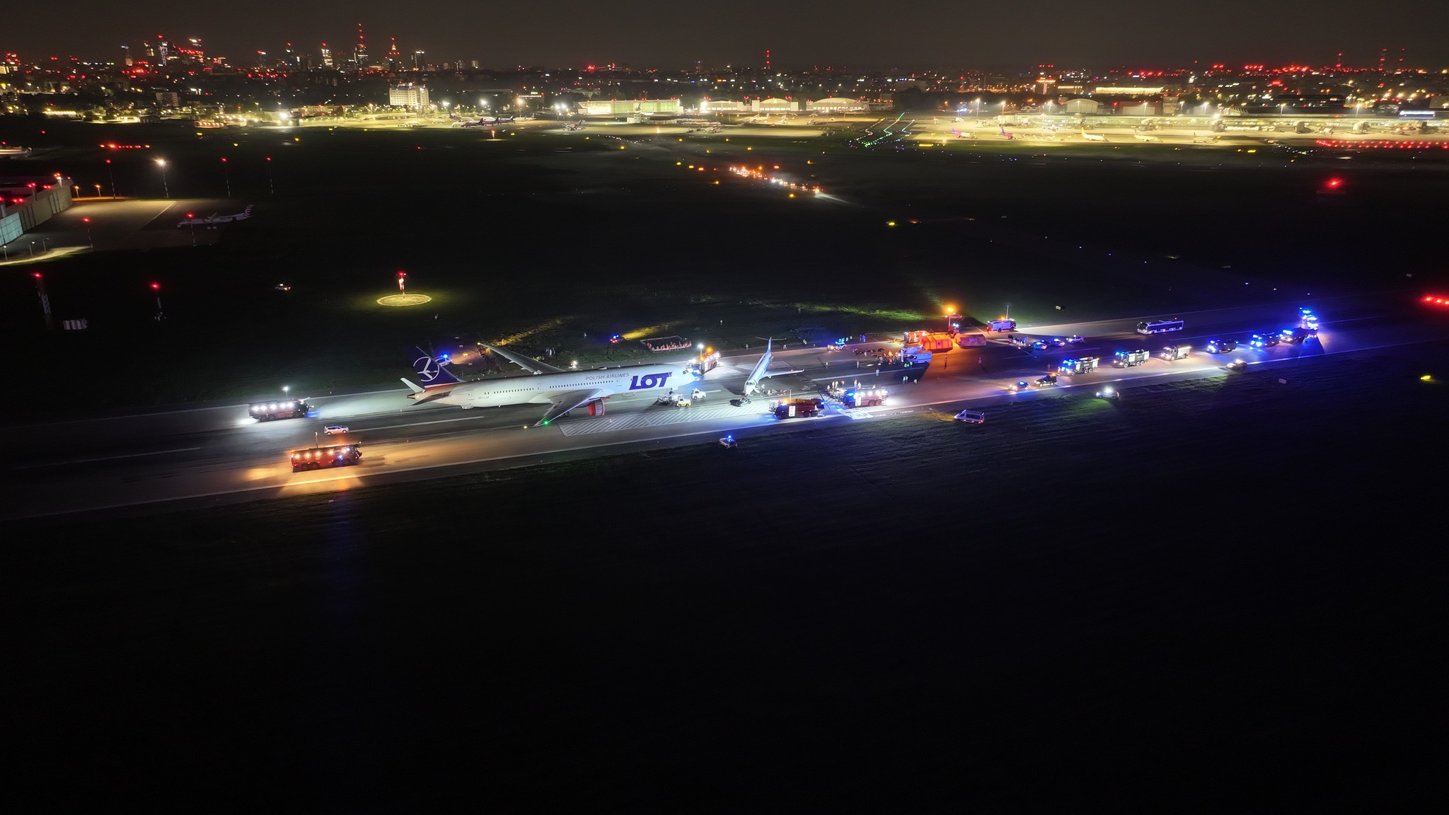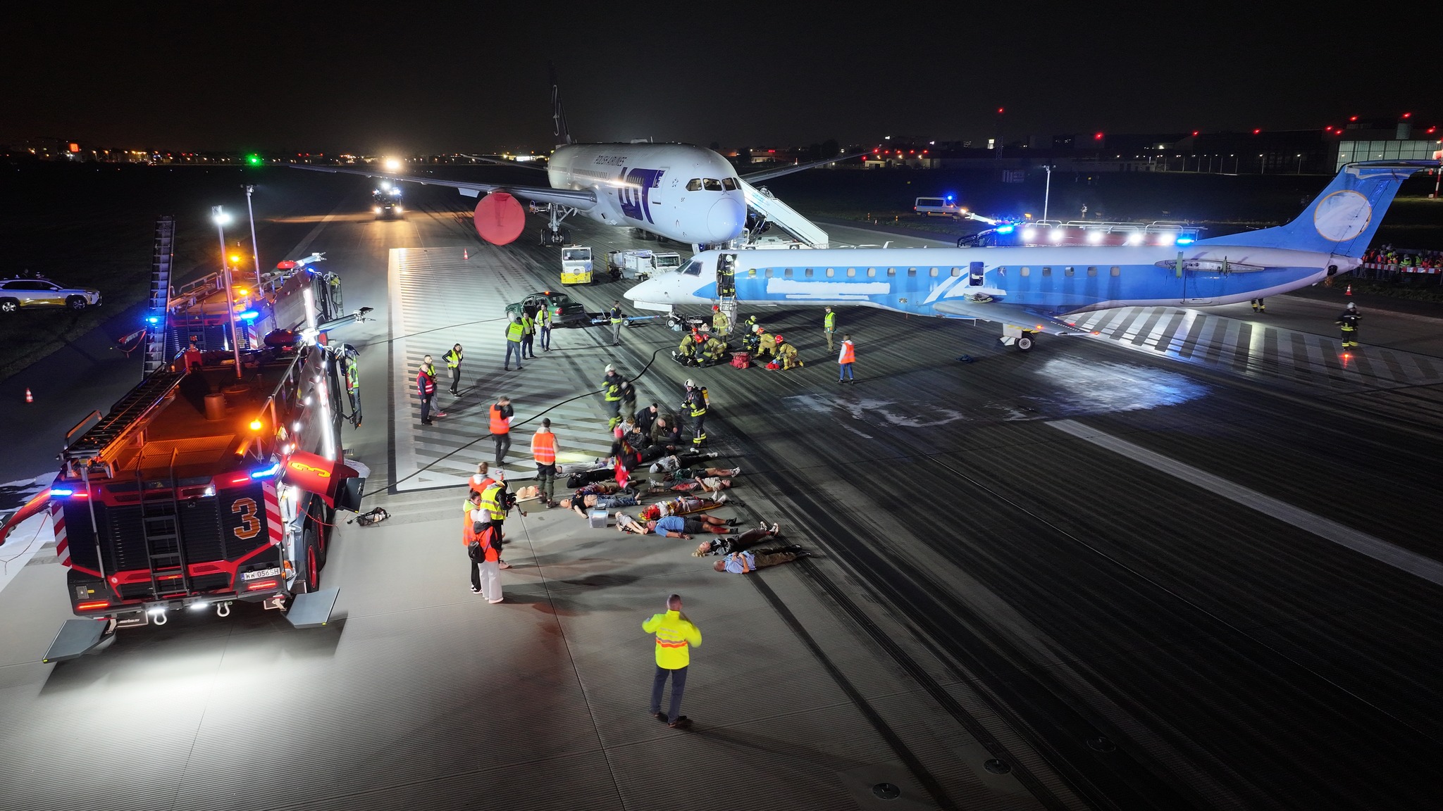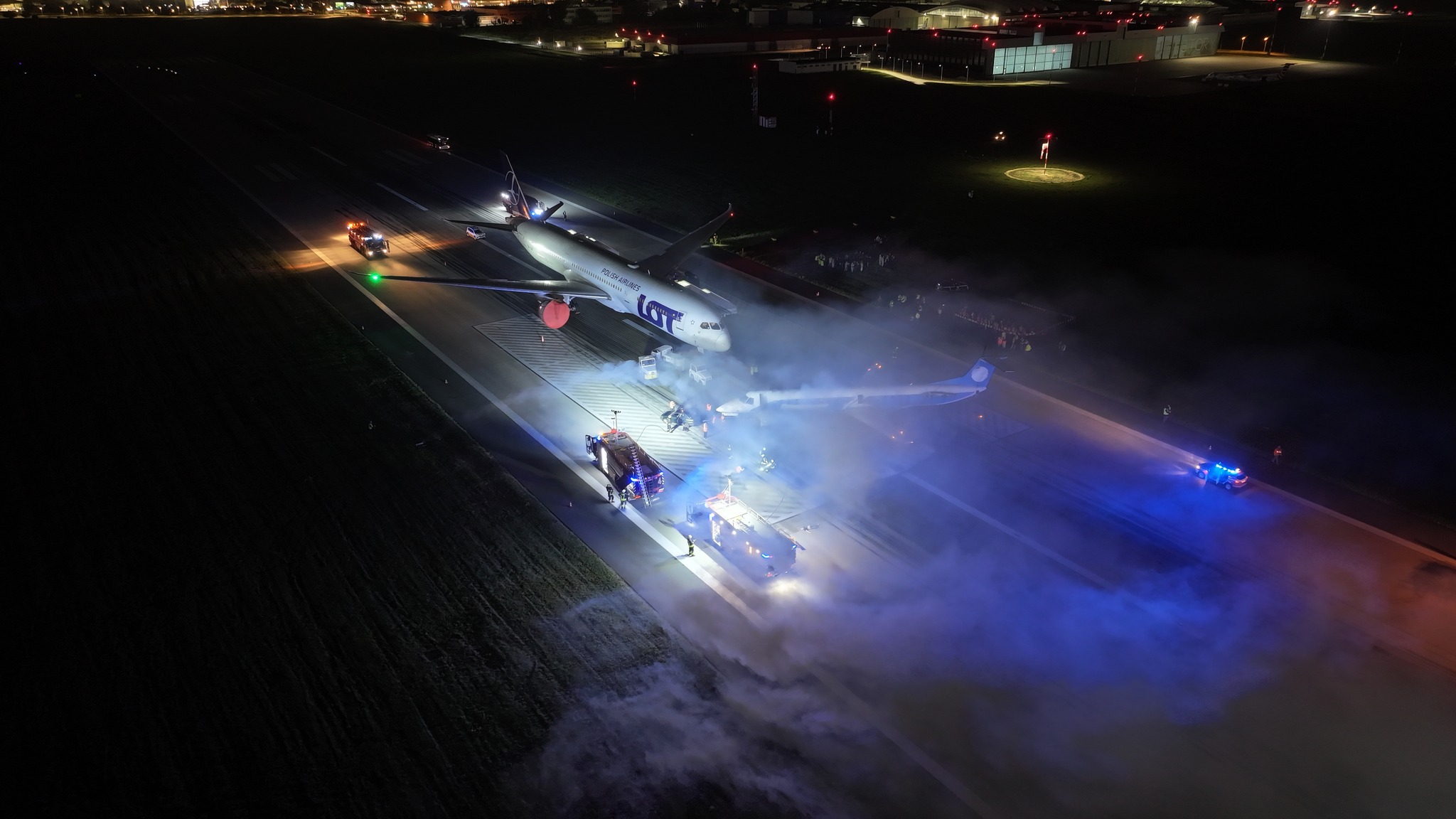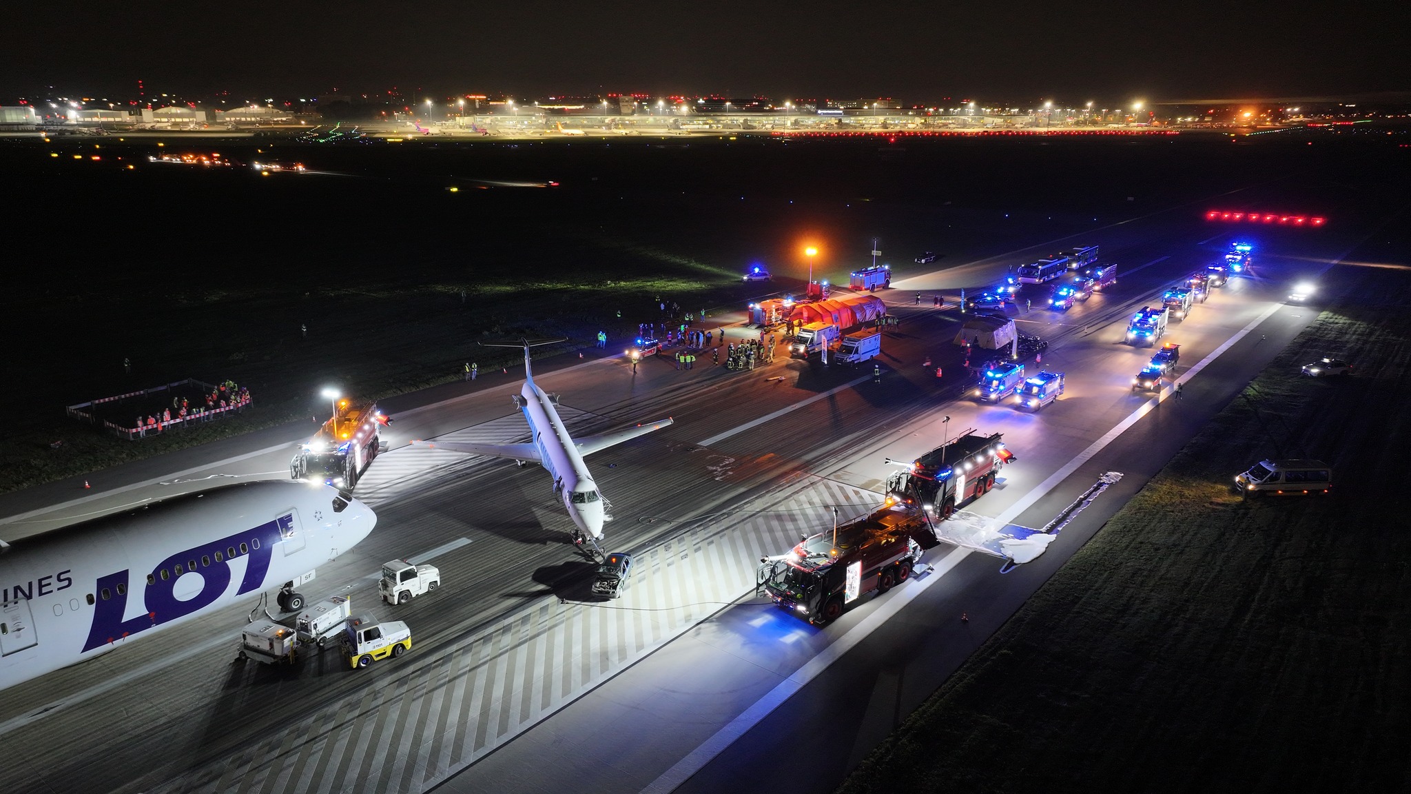 W nocy z 20 na 21 września na Lotnisko Chopina odbyły się 𝗰́𝘄𝗶𝗰𝘇𝗲𝗻𝗶𝗮 𝘀ł𝘂𝘇̇𝗯 𝘄 𝗿𝗮𝗺𝗮𝗰𝗵 𝗼𝗸𝗿𝗲𝘀𝗼𝘄𝗲𝗷 𝗼𝗰𝗲𝗻𝘆 𝗽𝗿𝘇𝘆𝗴𝗼𝘁𝗼𝘄𝗮𝗻𝗶𝗮 𝗹𝗼𝘁𝗻𝗶𝘀𝗸𝗮 𝗱𝗼 𝘀𝘆𝘁𝘂𝗮𝗰𝗷𝗶 𝘇𝗮𝗴𝗿𝗼𝘇̇𝗲𝗻𝗶𝗮. Ich celem było sprawdzenie współdziałania wszystkich organów w reakcji na wypadek statku powietrznego na terenie lotniska, w oparciu o „Plan Działania w Sytuacji Zagrożenia (PDSZ)”.
