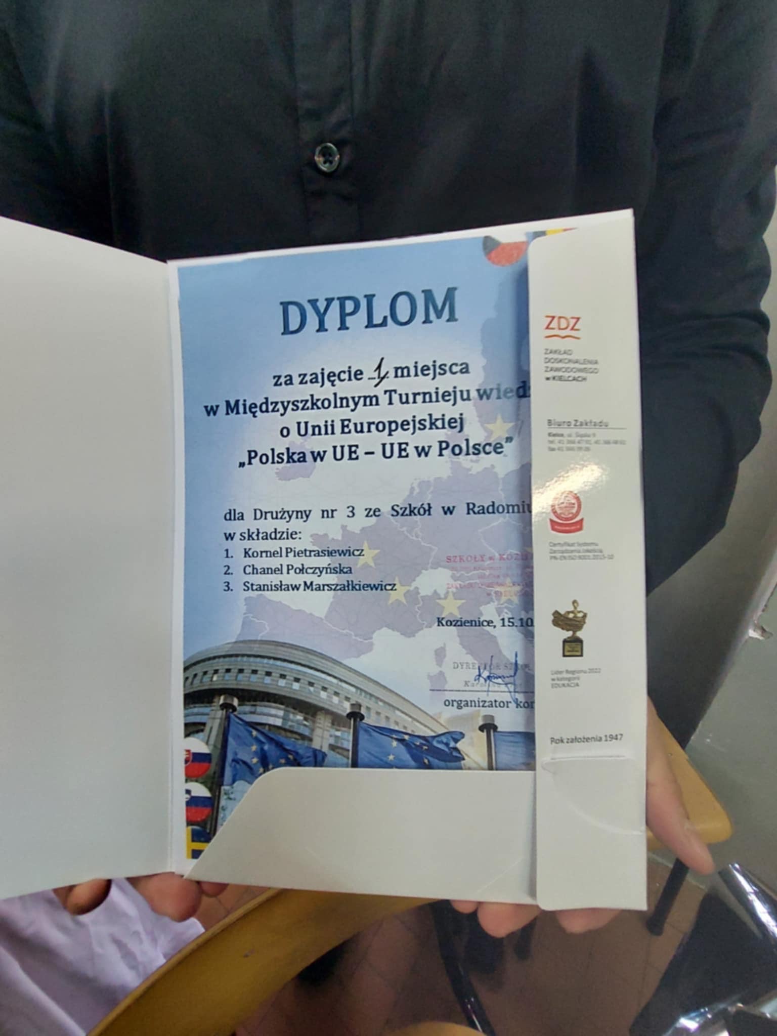 Nasi uczniowie Chanel Połczyńska i Kornel Pietrasiewicz zakwalifikowali się Międzyszkolnego Drużynowego Turnieju Wiedzy Unii Europejskiej i zdobyli w tym turnieju 1 miejsce. W turnieju brało udział 5 innych szkół Zakładu Doskonalenia Zawodowego. Konkurs odbył się 15 października w ZDZ Kozienice. Uczniowie otrzymali dyplom a także vouchery do media ekspert na kwotę 900 zł.