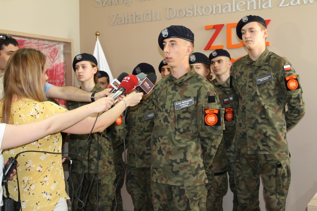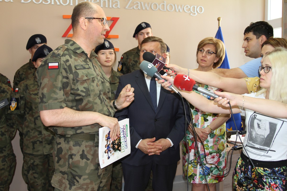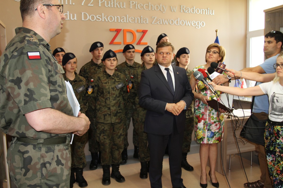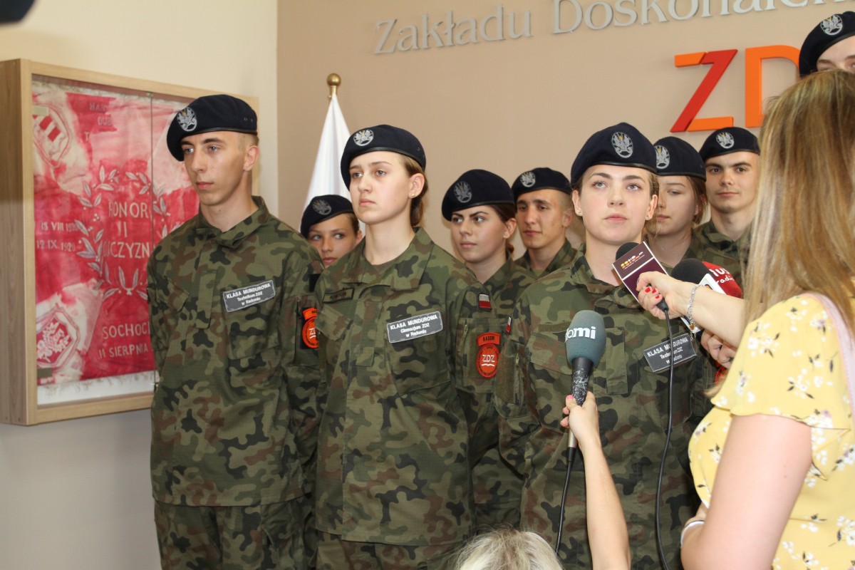 Po raz kolejny naszą szkołę odwiedził sekretarz stanu w Ministerstwie Obrony Narodowej, Wojciech Skurkiewicz. Tym razem okazją był briefing prasowy, zorganizowany 7 czerwca 2019 r. w związku z wyjazdem grupy uczniów do Longmoor w Anglii na międzynarodowy obóz kadetów - Central Training Camp „Baltic Guard 2019”. Wyróżnienie to szkoła zawdzięcza wysokim wynikom w realizacji programu pilotażowego MON oraz wzorcową współpracą z Ministerstwem Obrony Narodowej i Biurem do Spraw Proobronnych MON. Warto podkreślić, że nasza placówka jako jedyna szkoła w Polsce została wytypowana do reprezentowania Polski w Wielkiej Brytanii. Szkolenie jest skierowane do młodzieży z klas mundurowych państw NATO (Anglia, Litwa, Łotwa, Estonia, Polska, Kanada), jego organizator to United Kingdom Army Cadet Forces. Rolę koordynatora ze strony polskiej pełni Biuro do Spraw Proobronnych. W międzynarodowym towarzystwie uczniowie spędzą dziesięć dni wakacji, od 27 czerwca – 7 lipca 2019 r. W programie są zajęcia ze szkolenia strzeleckiego i z zakresu kształtowania kompetencji proobronnych. Kadeci z Radomia zwiedzą Londyn i Royal Military Academy. To tylko niektóre z czekających ich atrakcji. Minister Wojciech Skurkiewicz gratulował młodzieży wyjazdu i wyników w nauce, bo do Anglii uda się „złota” dziesiątka najlepszych uczniów. Z kolei dyrektor szkoły Katarzyna Kołodziejska podziękowała MON i osobiście ministrowi W. Skurkiewiczowi za współpracę i udzielane wsparcie w kształceniu uczniów klas mundurowych. Licznie przybyli na briefing dziennikarze prasy, radia, telewizji i portali internetowych skorzystali z możliwości dokonania bezpośrednich nagrań i prowadzenia wywiadów.