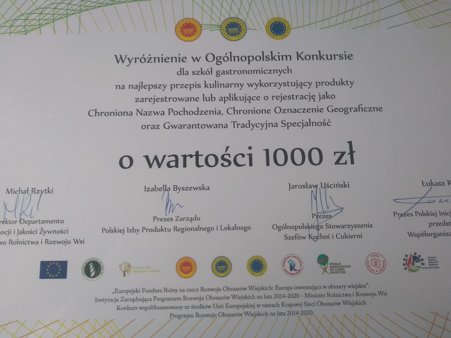8 czerwca 2019r. uczennica klasy 3tc Martyna Piwońska uczestniczyła w Finale VIII Edycji Ogólnopolskiego konkursu dlasszkół gastronomicznych na najlepszy przepis kulinarny wykorzystujący produkty zarejestrowane lub aplikujące o rejestrację jako Chroniona Nazwa Pochodzenia, Chronione Pochodzenie Geograficzne oraz gwarantowana tradycyjna specjalność. Organizatorem konkursu było Ministerstwo Rolnictwa i Rozwoju Wsi, Ogólnopolskie Stowarzyszenie Szefów Kuchni i Cukierni, Polska Izba Produktu Regionalnego i Lokalnego oraz Stowarzyszenie Polska Inicjatywa Kulinarna.