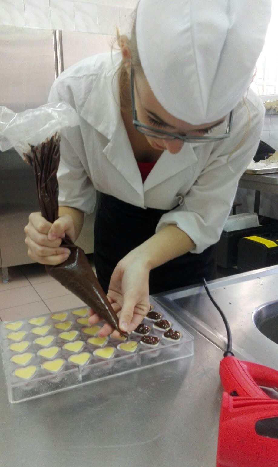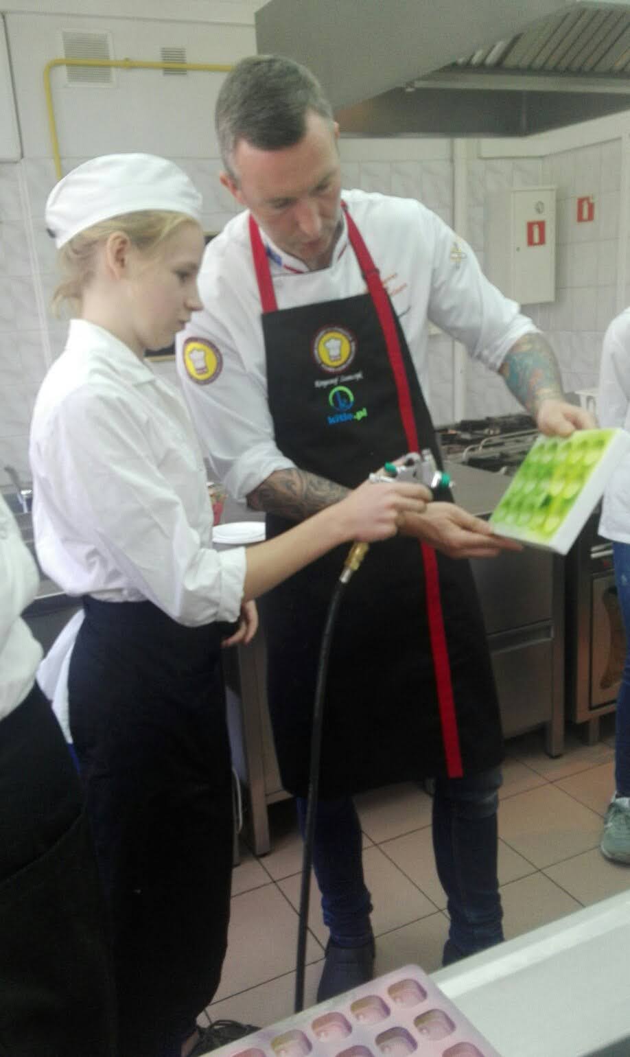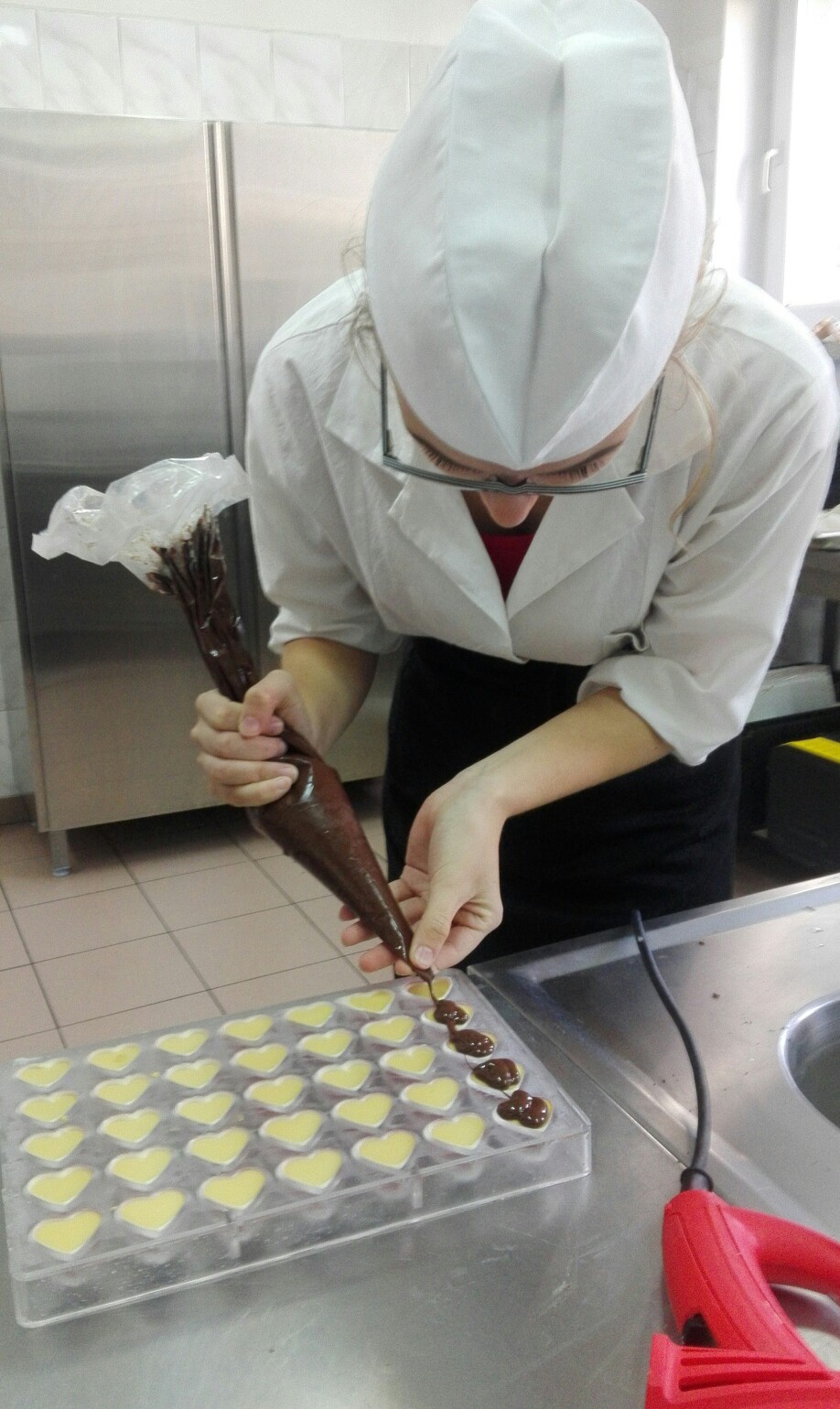 W dniach 3-4 października, uczniowie uczący się w kierunku Technik Żywienia i Usług Gastronomicznych, realizowali zajęcia z zakresu ,,podstaw pracy z czekoladą", w ramach projektu EKO SPECJALISTA - KUCHARZ. Podczas szkolenia uczniowie nauczyli się temperować czekoladę ( dzięki temu zabiegowi czekolada jest błyszcząca)i wylewać nią różne formy. Dowiedzieli się jak namalować na powierzchni pralin dowolny wzór, poznali także sposób przygotowywania nadzień tzw. ganaszy, w wielu nieoczywistych ale przepysznych smakach.