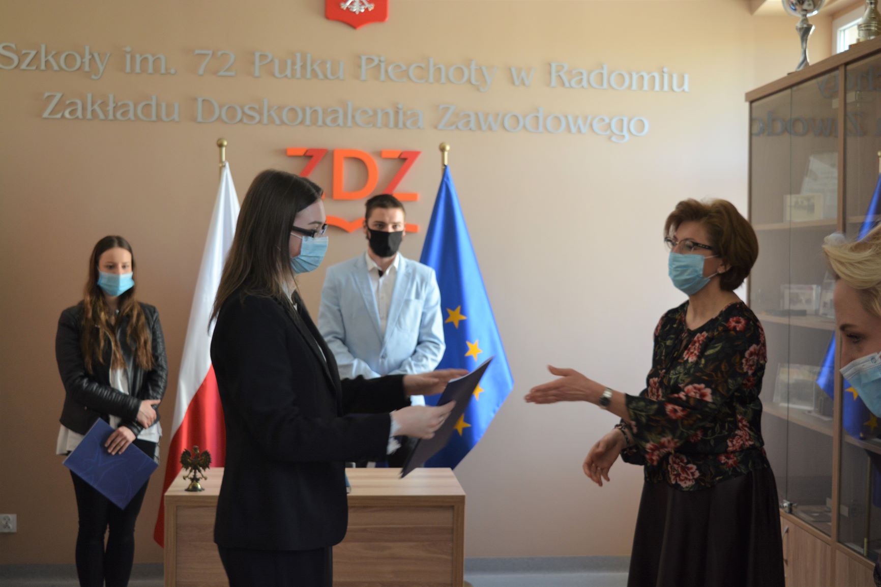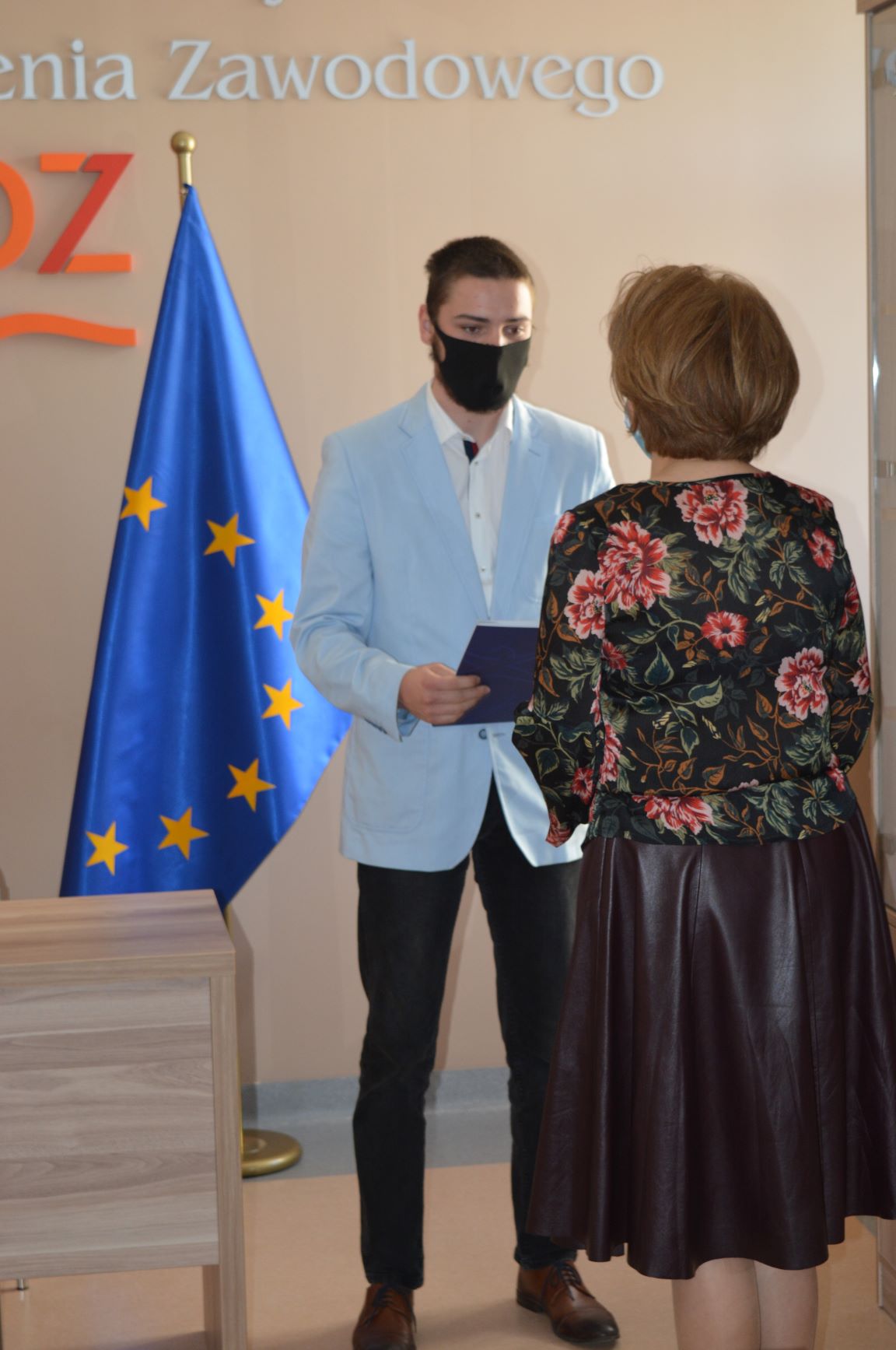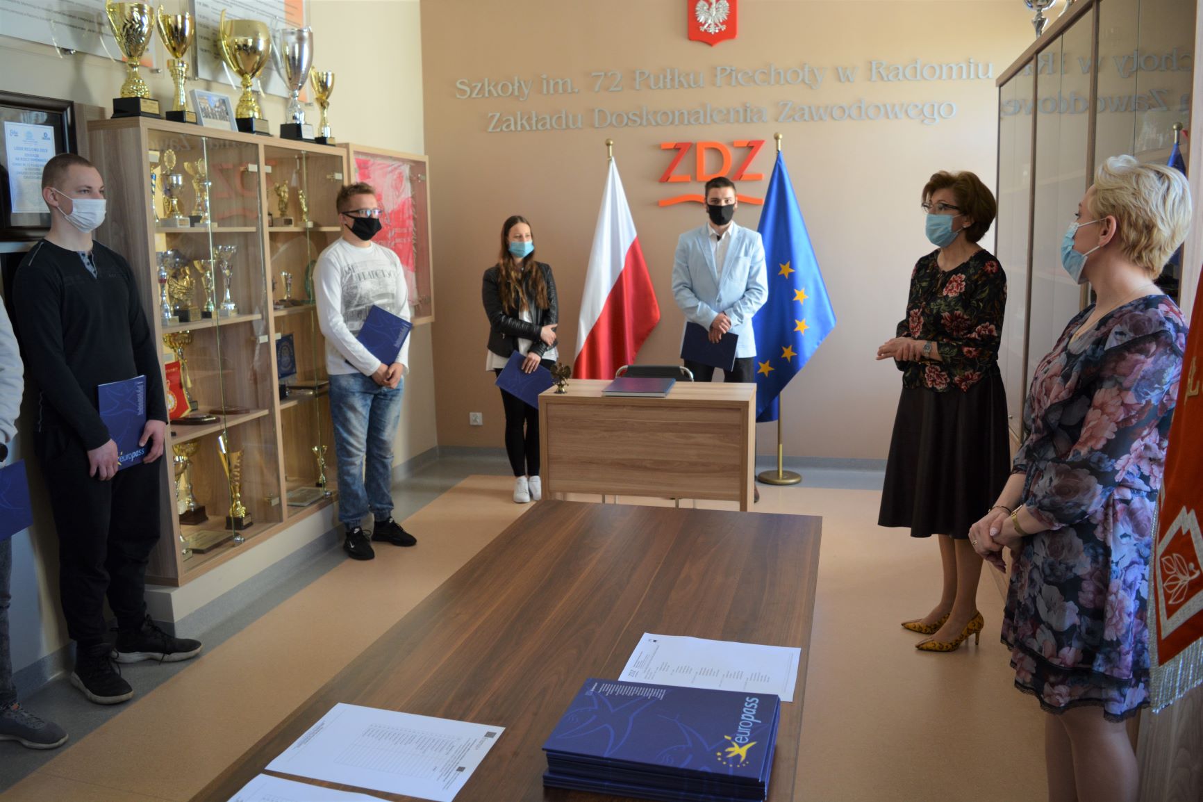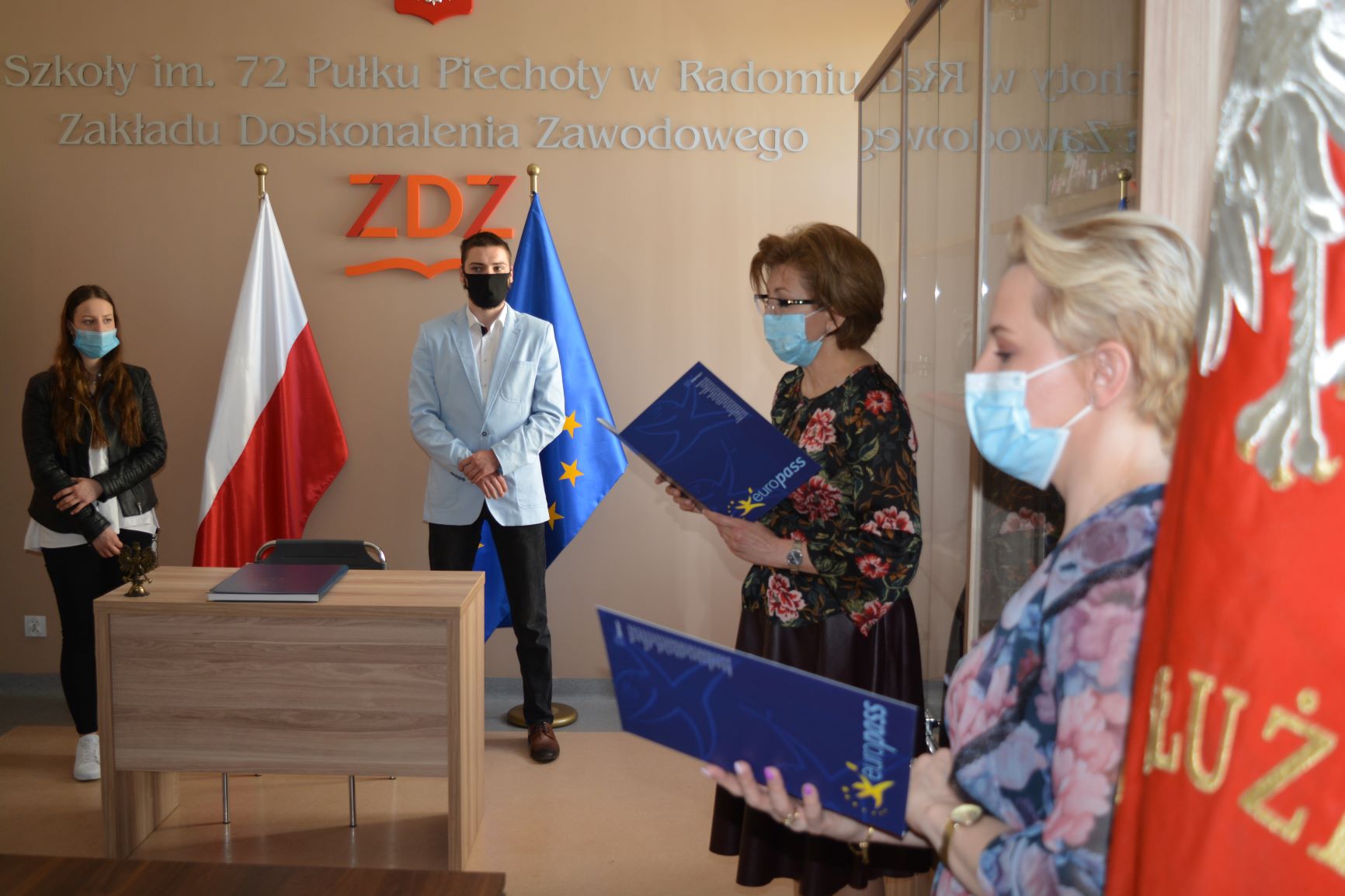 26 tegorocznych maturzystów z kierunków: technik usług fryzjerskich, technik żywienia i usług gastronomicznych, technik informatyk i technik logistyk, odebrało 10 maja 2021 r. bardzo ważne dokumenty, potwierdzające nabyte kwalifikacje zawodowe w trakcie nauki w szkole. To certyfikaty EUROPASS, zaświadczające o odbytym stażu zawodowym w Dreźnie oraz Walencji, w ramach europejskiego projektu ERASMUS.